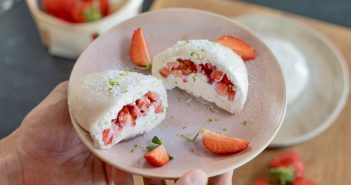 - Déposez un peu de crème au centre, ajoutez les fraises, recouvrez de crème, puis repliez la feuille pour former un gros mochi.