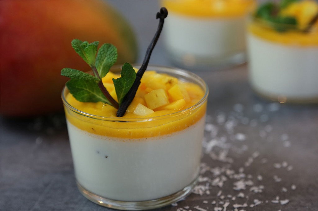 Réussir une panna cotta facilement, ça vous tente ? Testez cette recette gourmande et onctueuse proposée par Hervé pour la Saint Valentin ! Succombez aux saveurs exotiques : panna cotta infusée à la vanille, zeste de citron vert et noix de coco, coulis et petits cubes de mangue et d’ananas !