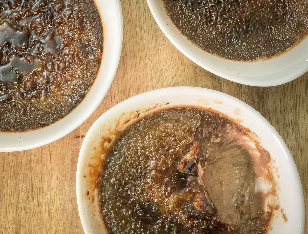 La crème brûlée très onctueuse avec une fine couche de caramel croquant, ici au chocolat et pâte à tartiner à la noisette. Une tuerie, facile à refaire à la maison. Je dis toujours, si on a un beau bruit de craquement avec la cuillère quand on tapote dessus c’est bon signe 🙂 Pour revoir la version de ma crème brûlée à la vanille c’est ici. Une version plus légère de crème aux oeufs ici.