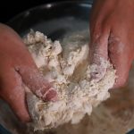 - Ajoutez l'eau au centre, mélangez pour obtenir une pâte homogène, et pétrissez 10 minutes à la main sur le plan de travail ou à l'aide d'une machine à pain ou d'un robot avec le crochet pétrisseur