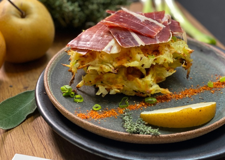 En recherche d’une nouvelle idée recette à partager à l’apéritif ? Voici des rosties de pomme de terre bien croustillants servis avec du jambon ibérique espagnol de qualité. J’ai réalisé cette recette en collaboration avec #HamPassionTour. L’idée ici était de créer une bonne recette festive et conviviale autour de ces jambons espagnols. Les jambons ibériques et notamment celui appelé “Bellota” sont vraiment excellents à mon goût. Ils sont issus de porcs élevés dans la Dehesa, un territoire naturel dans le Sud de l’Espagne, où les porcs se nourrissent de glands issus des nombreux chênes qui poussent dans la région, ce qui confère au jambon Bellota un goût et une finesse unique.