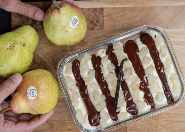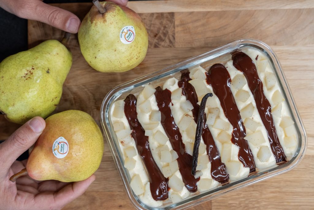 Ici, le classique tiramisu se réinvente avec des poires Williams fondantes issue des Vergers écoresponsables, doucement pochées dans un sirop à la vanille, et une crème au mascarpone onctueuse relevée d’une touche de chocolat noir fondu.