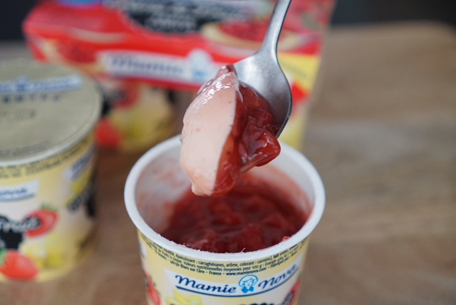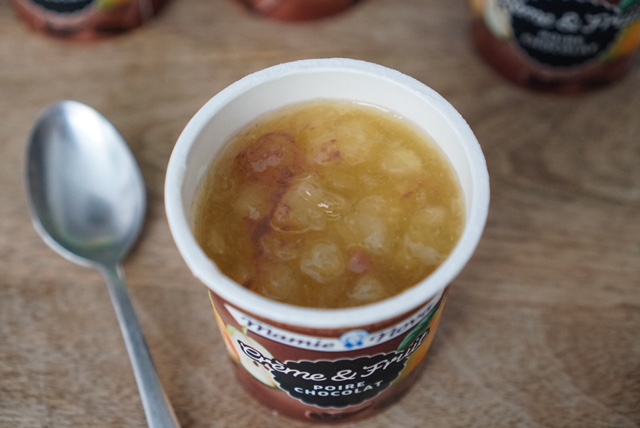 A l’ouverture, on ne voit que la compotée de poires, et dès que l’on plonge la cuillère dans le pot, on arrive à la crème. La répartition est bien équilibrée, beaucoup plus de fruits que ce à quoi je m’attendais. Ce n’est pas « lit » de fruit ou une surcouche, on est proche du 50/50 ! La compotée est bien dosée en sucre, les morceaux de poire sont agréables et fondants. La crème chocolat est onctueuse et s’associe bien avec la poire, personnellement j’aime le chocolat intense (70% et au dessus) et cela aurait pu être plus corsé, on reste sur un goût chocolat assez doux. C’est vraiment un dessert en soit, un pot suffit pour finir le repas ou comme en-cas. Passons à la seconde recette…